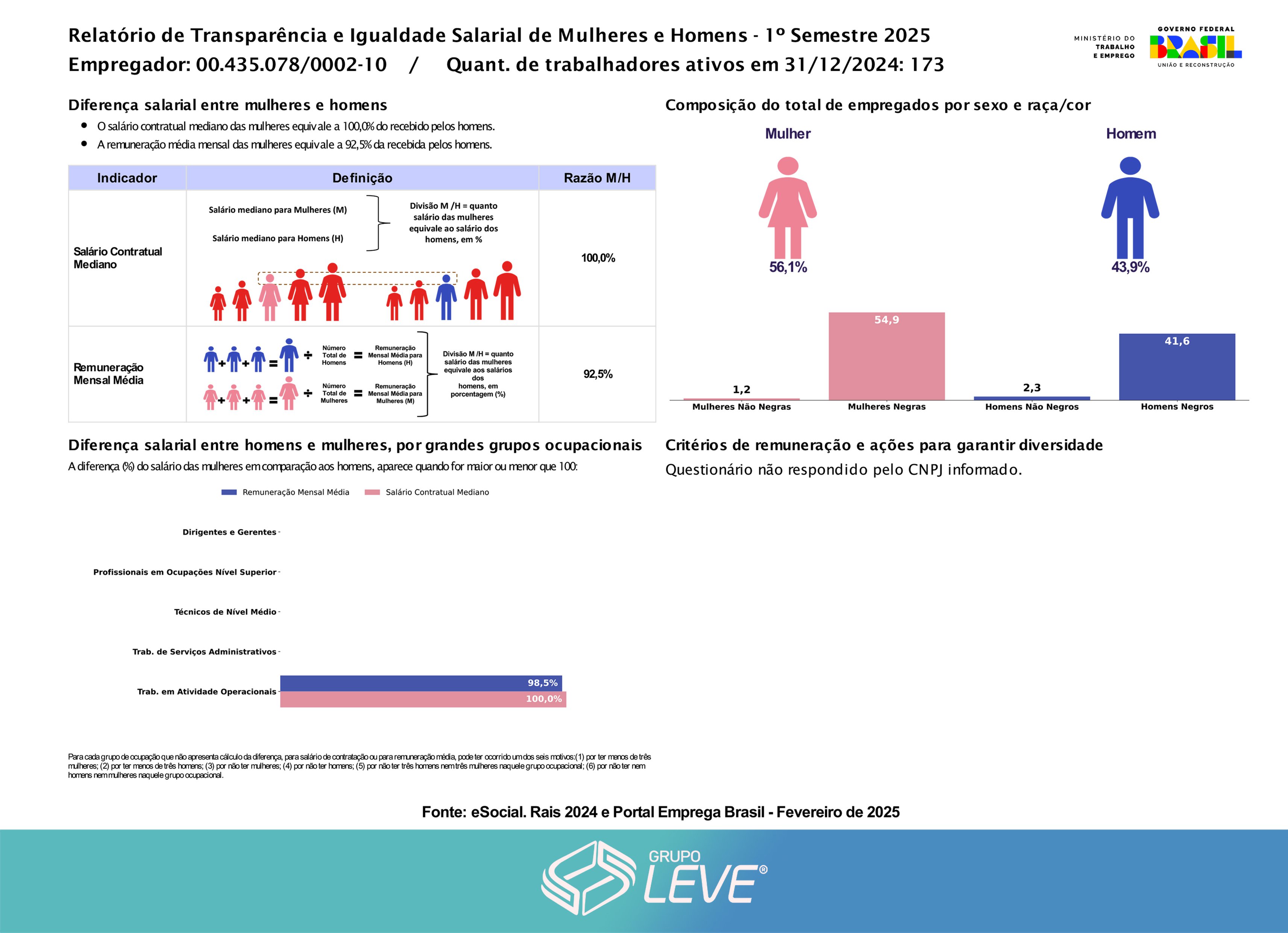 A publicação se dá em cumprimento da Lei 14.611 de 03/07/2023, do Decreto 11795 de 23/11/2023 e da Portaria TEM 3714 de 24/11/2023, que dispõem sobre a igualdade salarial e de critérios remuneratórios entre mulheres e homens para a realização de trabalho de igual valor ou no exercício da mesma função.